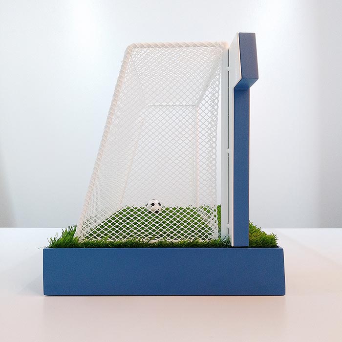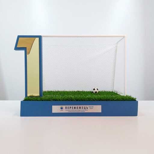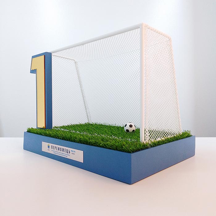 Уникальный наградной кубок для футбольных соревнований. Миниатюрная копия футбольных ворот с имитацией травяного газона и объемной цифрой «1» для победителя. Изготовлен из высококачественных материалов: основы из бука, окрашенного в черный цвет, белых металлических трубок, металлической сетки и акриловой цифры с эффектом золота.