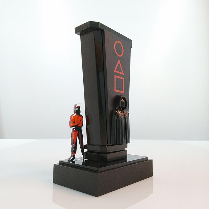 Объемные фигуры: в центре — черная 3D-модель Мастера Игры в капюшоне, а по бокам — фигурки Охранников в красных комбинезонах (изготовлены из акрила).
