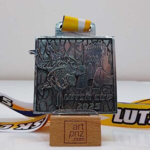 Сверху медали предусмотрено прочное интегрированное ушко для крепления ленты. Лента имеет яркий дизайн в сине-желтых цветах, с большой надписью «LUTSK CUP», что дополняет визуальную привлекательность награды и подчеркивает ее связь с событием.