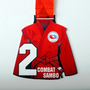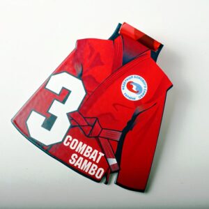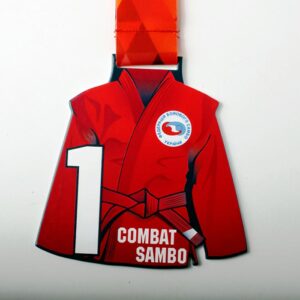 Изготовлена в трех вариантах: 1,2,3 место в виде красного кимоно для самбо. Красная репсовая лента.