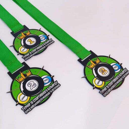 Медаль «Спортивный бильярд» — это оригинальная, высококачественная награда, разработанная специально для турниров по бильярду, включая соревнования среди военнослужащих и ветеранов. Благодаря использованию современной УФ-печати на металле, медаль имеет яркий, полноцветный дизайн.