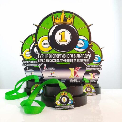 Дизайн (аверс): Центральное изображение — шар №8 в короне, окруженный звездами. Содержит надписи: «ТУРНИР ПО СПОРТИВНОМУ БИЛЬЯРДУ СРЕДИ ВОЕННОСЛУЖАЩИХ И ВЕТЕРАНОВ», «ХАРЬКОВ» и год «2025».