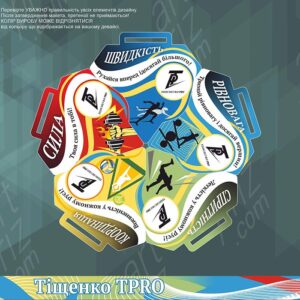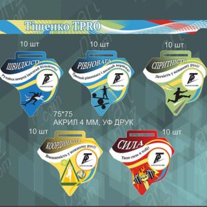 Тематический дизайн: На медалях изображены силуэты спортсменов, символизирующие различные виды спорта, а также названия спортивных качеств: «Сила», «Скорость», «Равновесие», «Ловкость», «Координация».