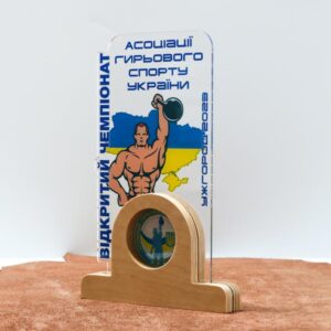 Награда выполнена из акрила с деревом плюс нанесение УФ печати.