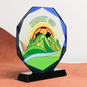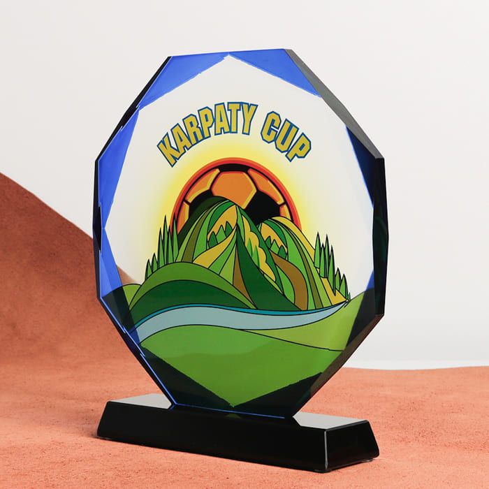 Стеклянная премиум награда (приз) изготовлена как образец из толстостенного стекла с нанесением высококачественной УФ-печати или гравировки.