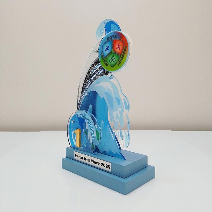 Представляем эксклюзивную награду от «Артприз», созданную специально для соревнований по триатлону «Svitiaz Iron Wave 2025». Этот динамичный и символический приз идеально отражает дух триатлона, сочетая водные элементы, скорость велосипеда и выносливость бегуна.
